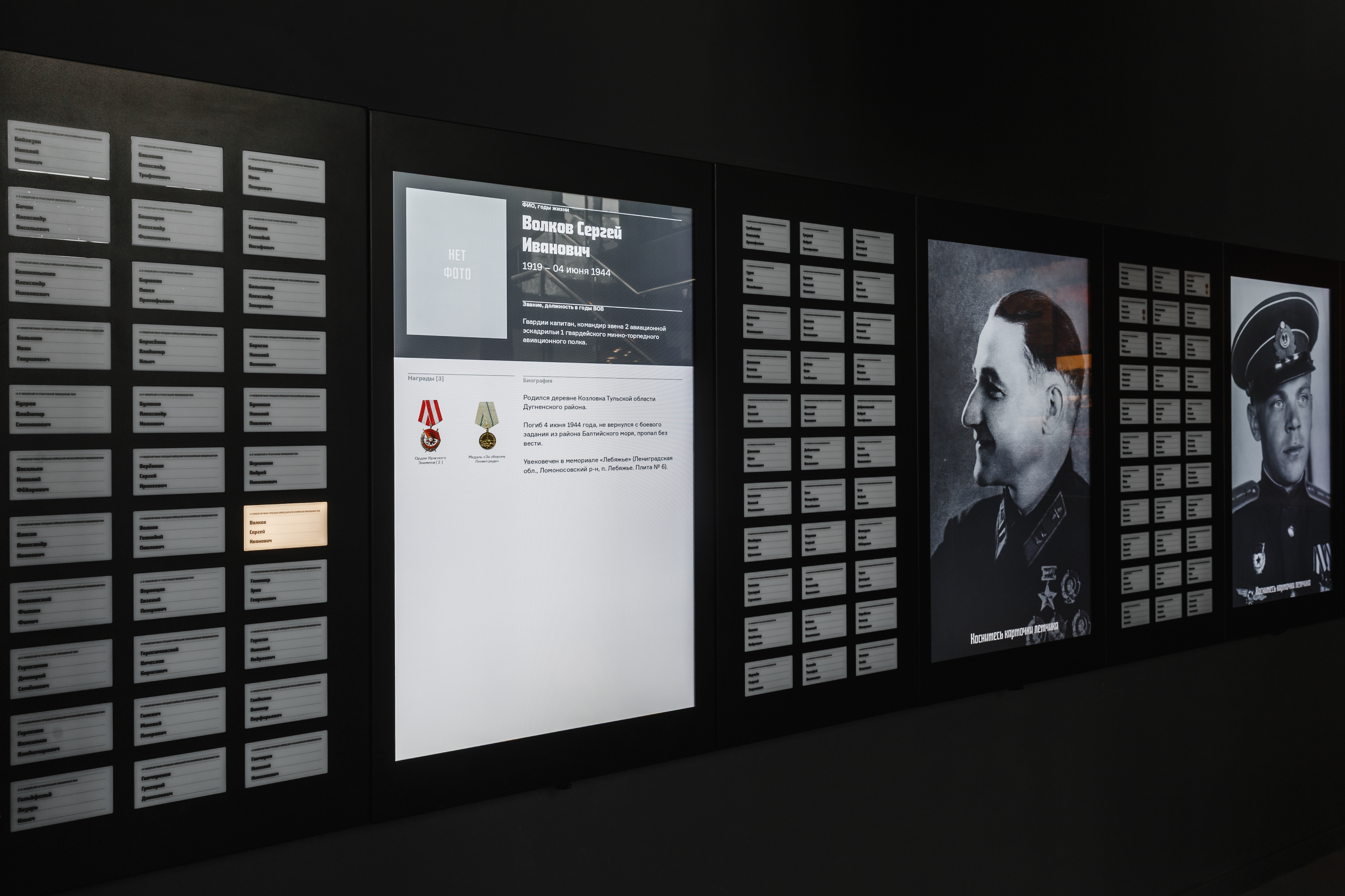 Центральное место здесь отводится инсталляции «Боевой вылет». Она представляет собой полноразмерную копию кабины истребителя Як-9. Это авиасимулятор. Перед зрителями с помощью проекционных экранов создается полная иллюзия полета, происходящего в разных погодных и боевых условиях. Посетитель наблюдает за боевым вылетом торпедоносца глазами лётчика. - География проекта