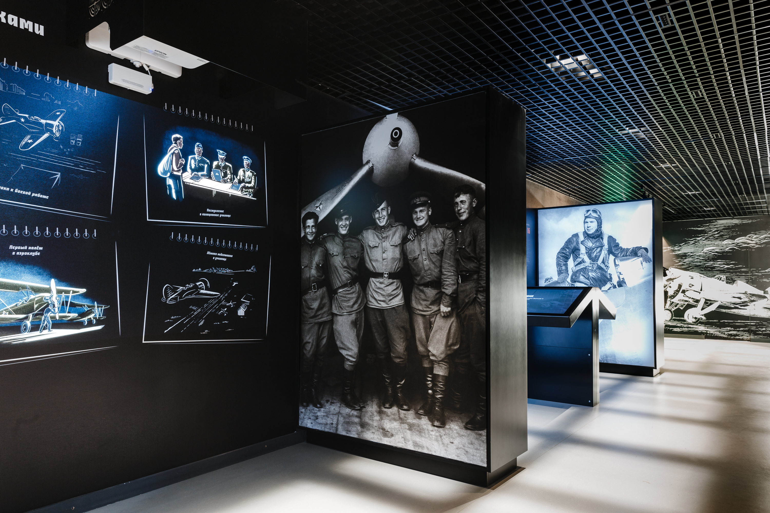 «Дом авиаторов» - это музей, полностью посвящённый истории авиационных соединений и лётчиков, принимавших участие в битве за Ленинград. Интерактивная экспозиция раскрывает тему даже при условии небольшого предметного ряда музея.Например, в центральной зоне расположен интерактивный проекционный стол диаметром 1920 мм, рассказывающий о боевом пути авиационных соединений в формате "день за днём". Стол дополнен двумя панорамными экранами для отображения архивной кинохроники. Всё проекционное и световое оборудование центральной зоны компактно размещается в круглой подвесной конструкции, композиционно дополняющей стол и панорамные экраны.