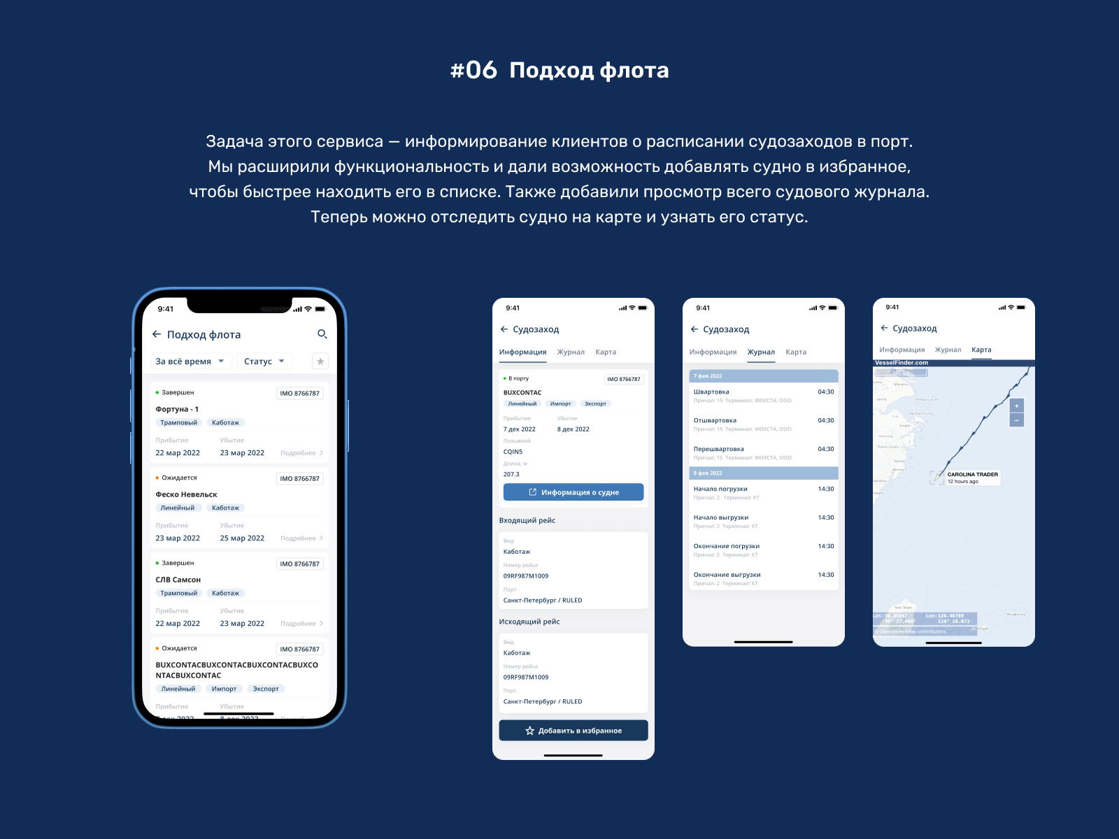 #06 Подход флота. Задача этого сервиса — информирование клиентов о расписании судозаходов в порт. Раньше клиенты пользовались сайтом, чтобы посмотреть расписание движений на экспорт, импорт и каботаж, и у них не было возможности посмотреть больше информации о судне. Мы расширили функциональность и дали возможность добавлять судно в избранное, чтобы быстрее находить его в списке. Также добавили просмотр всего судового журнала.