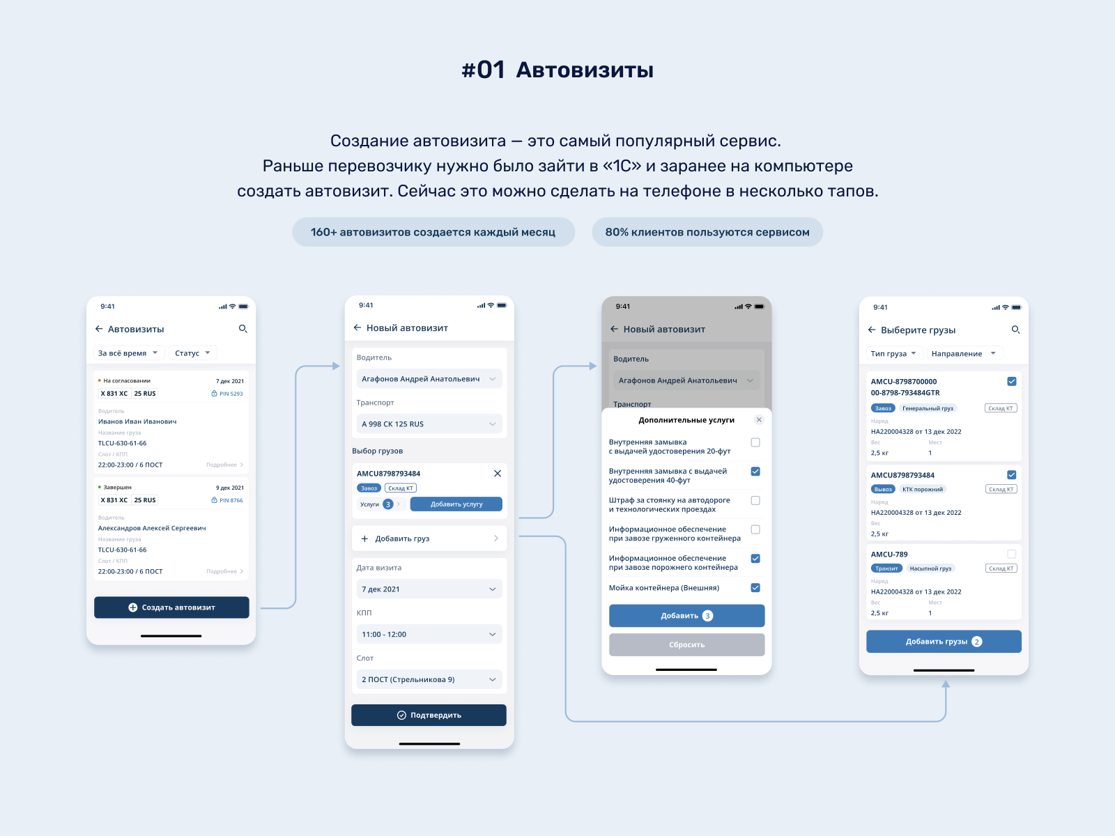 #01 Автовизиты. Создание автовизита — это самый популярный сервис. Раньше перевозчику нужно было зайти в «1С» и заранее на компьютере создать автовизит. Сейчас это можно сделать на телефоне в несколько тапов.