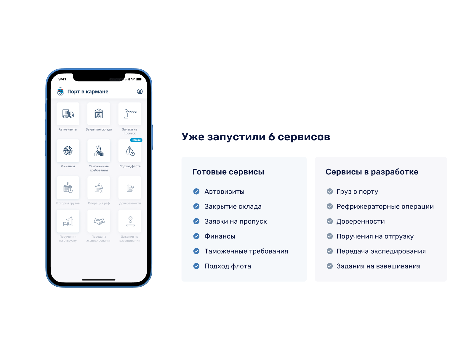 Уже запущенные сервисы решают следующие задачи клиентов: создание автовизитов и заявок на пропуск для посещения порта, оформление заявок на закрытие склада для забора груза, доступ к нужным документам (от договора до сверки операций), возможность проверки статуса груза на таможне, подход флота, информирование клиентов о расписании судозаходов в порт.