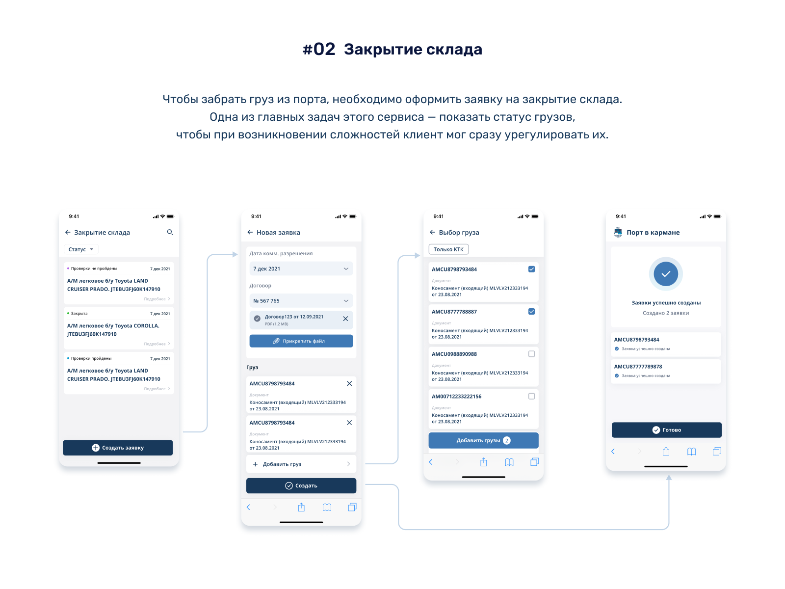 #02 Закрытие склада. Чтобы забрать груз из порта, необходимо оформить заявку на закрытие склада. Одна из главных задач этого сервиса — показать статус грузов, чтобы при возникновении сложностей клиент мог сразу урегулировать их.