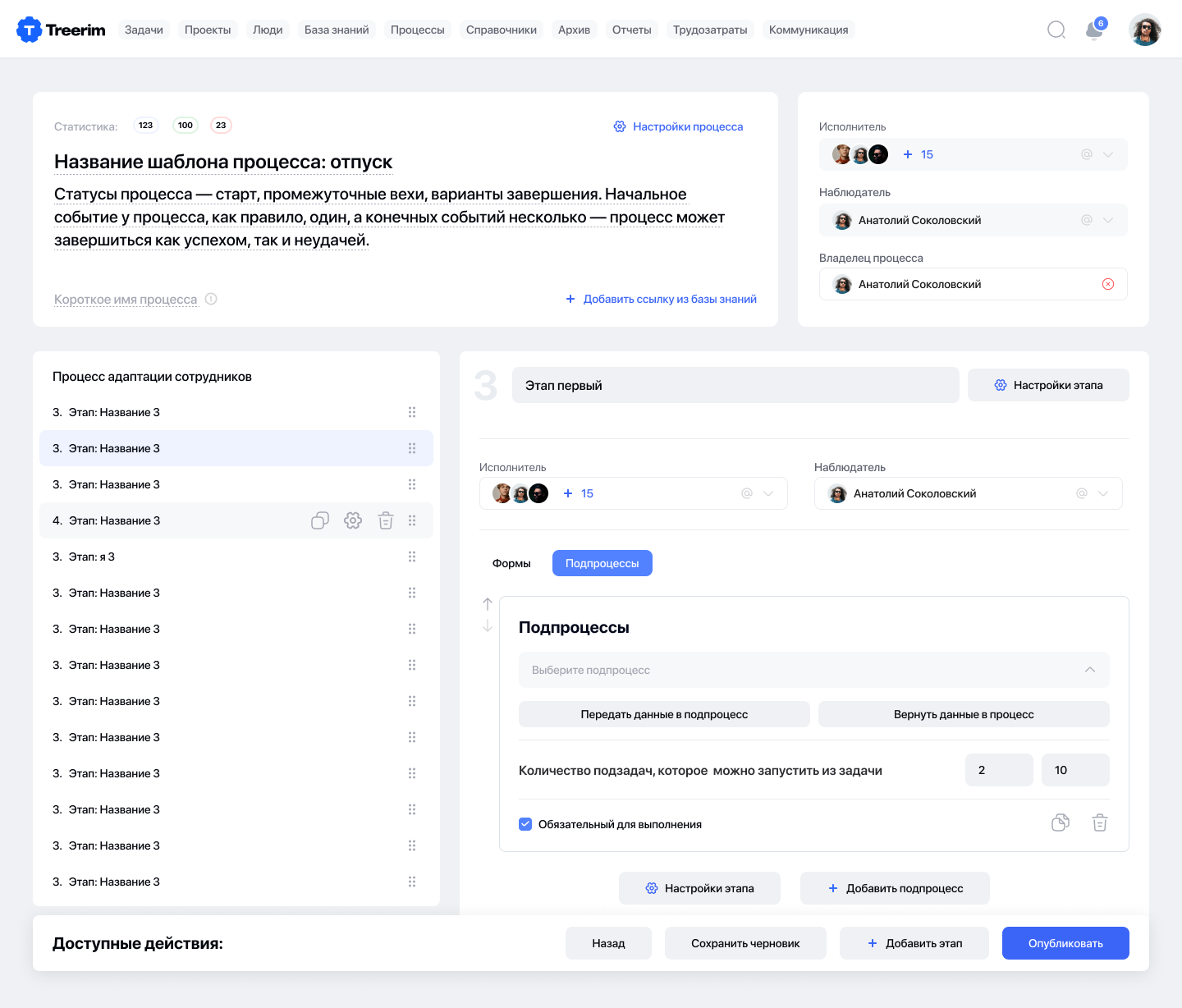 Гибкий менеджер процессов – позволяет не знакомому с IT пользователю выстроить и автоматизировать процессы. Бизнес сталкивается с проблемой длительного ожидания разработки программного обеспечения под необходимые процессы. Платформа решает эту проблему и позволяет сократить время и бюджет на управление процессами. В ней доступны различные типы форм, гибкие настройки этапов, авто-назначение исполнителей по настроенным критериям и данным системы.