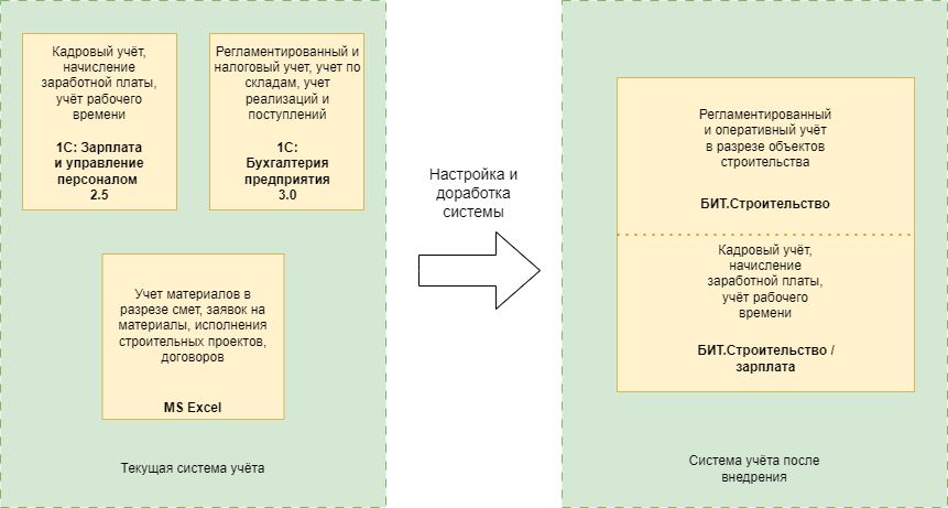 Ранее компания использовала «1С:Бухгалтерия предприятия» версии 3.0 для ведения регламентированного, налогового и складского учёта и «1С:Зарплата и управление персоналом» версии 2.5 для ведения кадрового учёта и расчёта заработной платы. Отраслевая специфика, например, учет материалов в разрезе смет, заявки на материалы, исполнение строительных договоров, велась в таблицах MS Excel. Работа с трех различных системах отнимает время пользователей и принуждает дублировать и переносить данные.