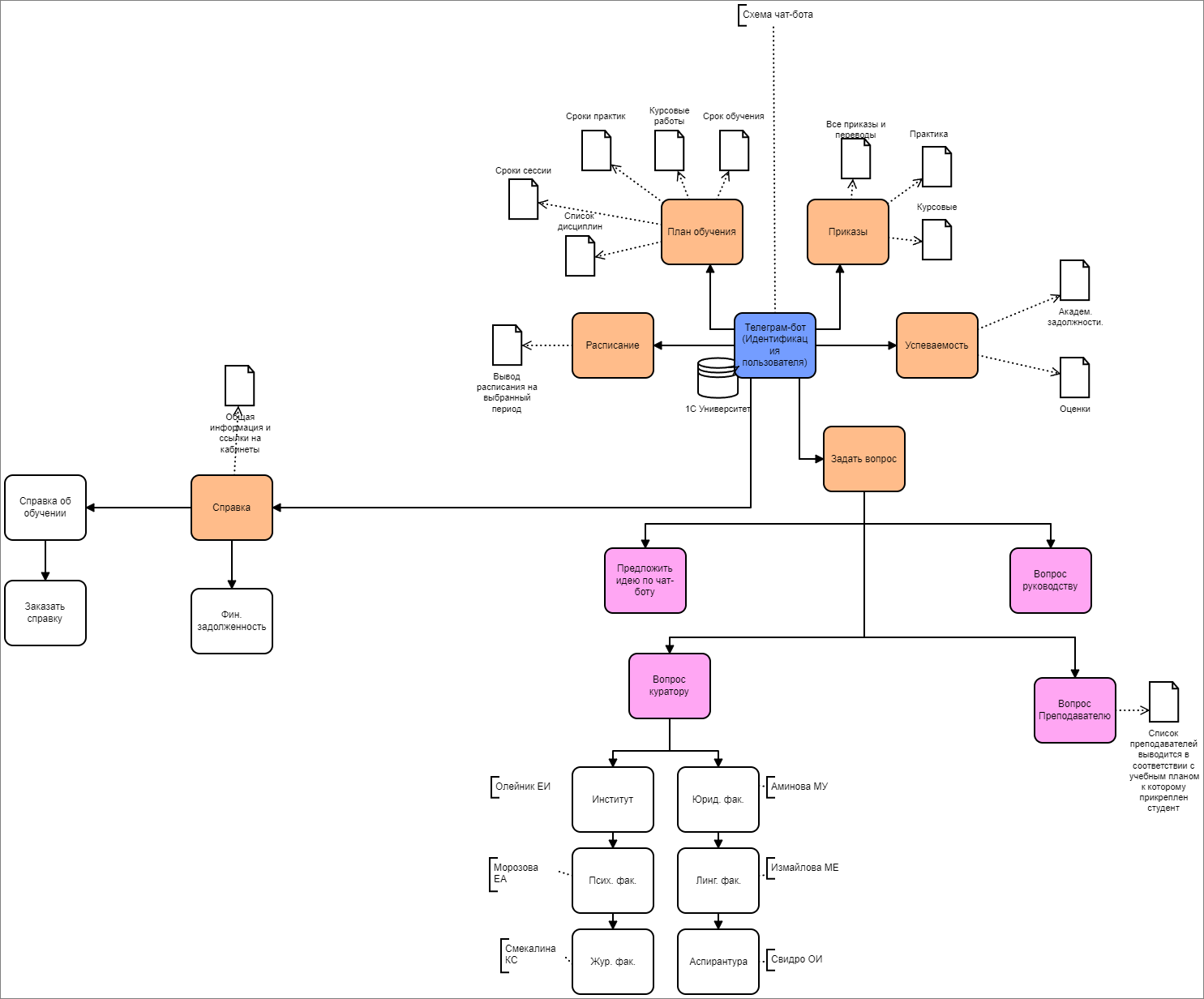 Чат-бот может выводить информацию по успеваемости, академическим долгам, приказам по студентам (по практикам, курсовым, переводам), по плану обучения (сроки сессий, сроки практик, курсовые работы, список дисциплин, срок обучения), отображать расписание занятий (выгружать расписание занятий в календарь мобильного телефона), задавать вопросы куратору, руководству через чат-бот, заказывать справки об обучении.