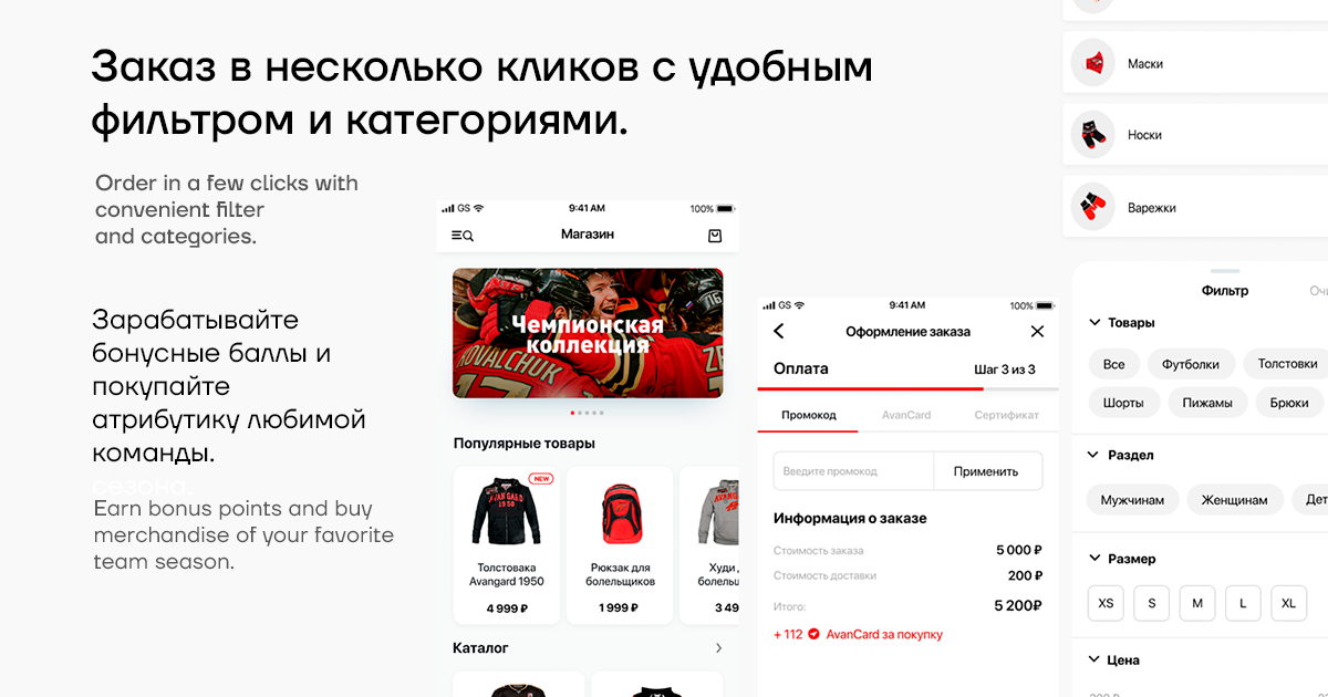 Интернет-магазин атрибутики прямо внутри мобильного приложения ХК Авангард. Удобная фильтрация, выбор категорий товара, простой способ оплаты в несколько кликов. Используйте накопленные баллы и получайте товары любимой команды со скидкой.