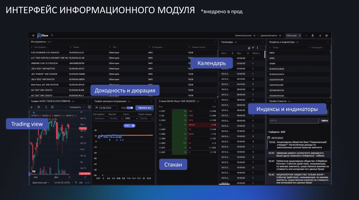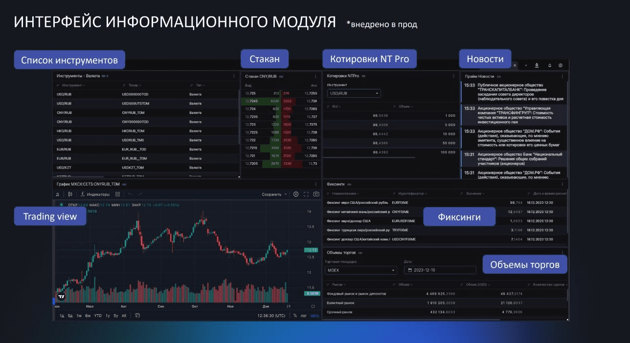 Информационно-торговый терминал для участников российского финансового рынка с возможностью вести переговоры, заключать сделки, общаться в чатах, получать информацию о риал-тайм и архивных данных по финансовым инструментам, аналитику и новости.