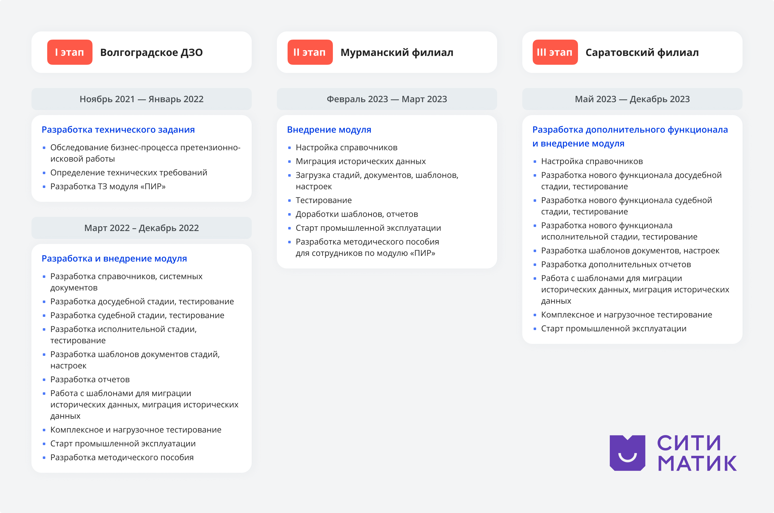 Следующим регионом для запуска системы стала Мурманская область. Внутренние алгоритмы блока ПИР адаптировали с учетом особенностей сбытовой базы региона. Совместная команда ИТ-партнера и «Ситиматик» внедрила дополнительный функционал для проекта в Саратовской области: детализированный учет данных по банкротству, апелляционной и кассационной инстанциям, расширенные отчеты. Модули в Волгограде и Мурманске были также обновлены до усовершенствованной версии саратовского филиала.