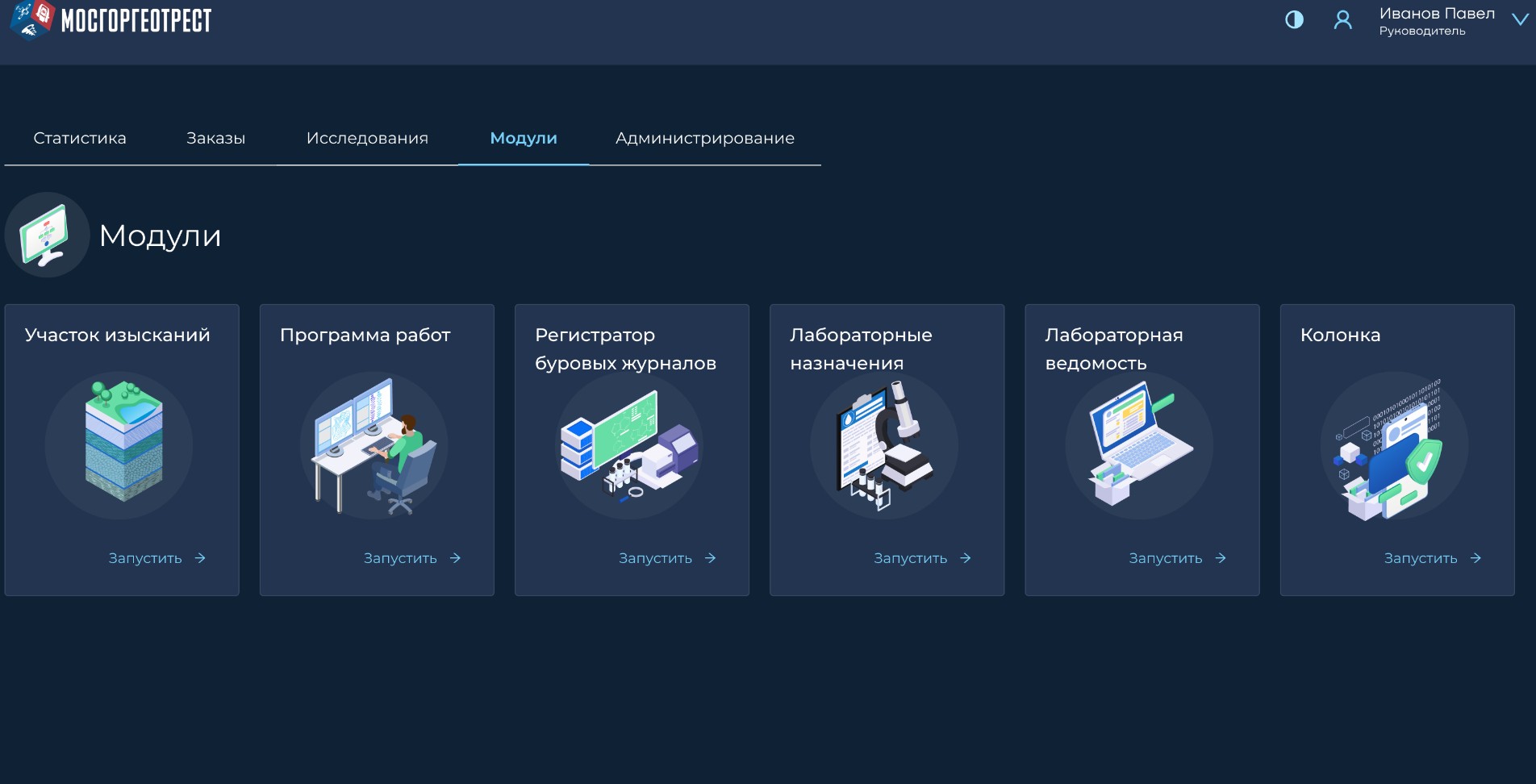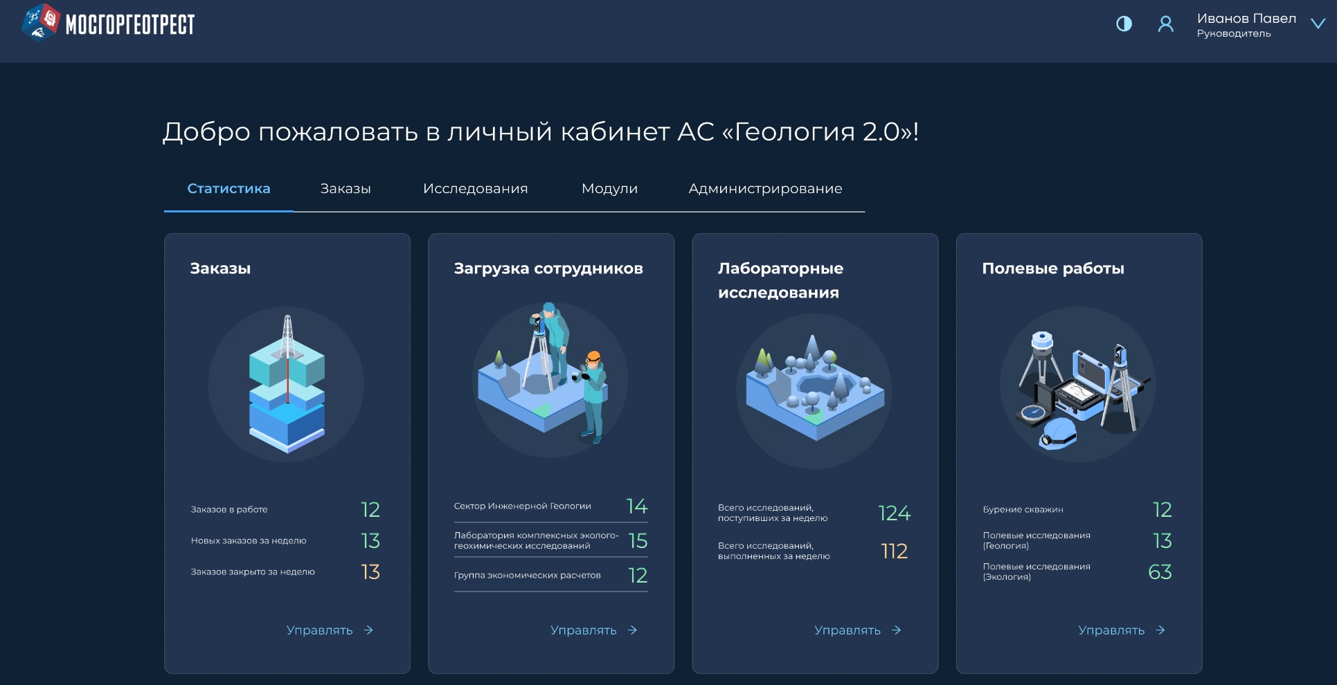 В соответствии с итогами закупочных процедур, для выполнения вышеуказанных задач был заключен контракт с ИТ-компанией «Инфосистемы Джет», обладающей необходимым опытом и квалификацией. В процессе исполнения контракта проведено обследование бизнес-процессов отдела инженерно-геологических изысканий, по результатам которого была спроектирована и разработана автоматизированная система «Геология 2.0».