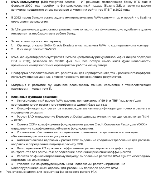 RWA-калькулятор (Risk-Weighted Assets) — ИТ-решение, позволившее банку ВТБ еще в феврале 2020 года перейти на финализированный подход (Базель 3,5), а также на расчет величины кредитного риска на основе внутренних рейтингов (ПВР) в 2022 году.