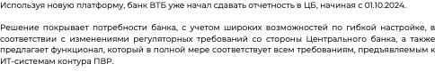 Используя новую платформу, банк ВТБ уже начал сдавать отчетность в ЦБ, начиная с 01.10.2024.