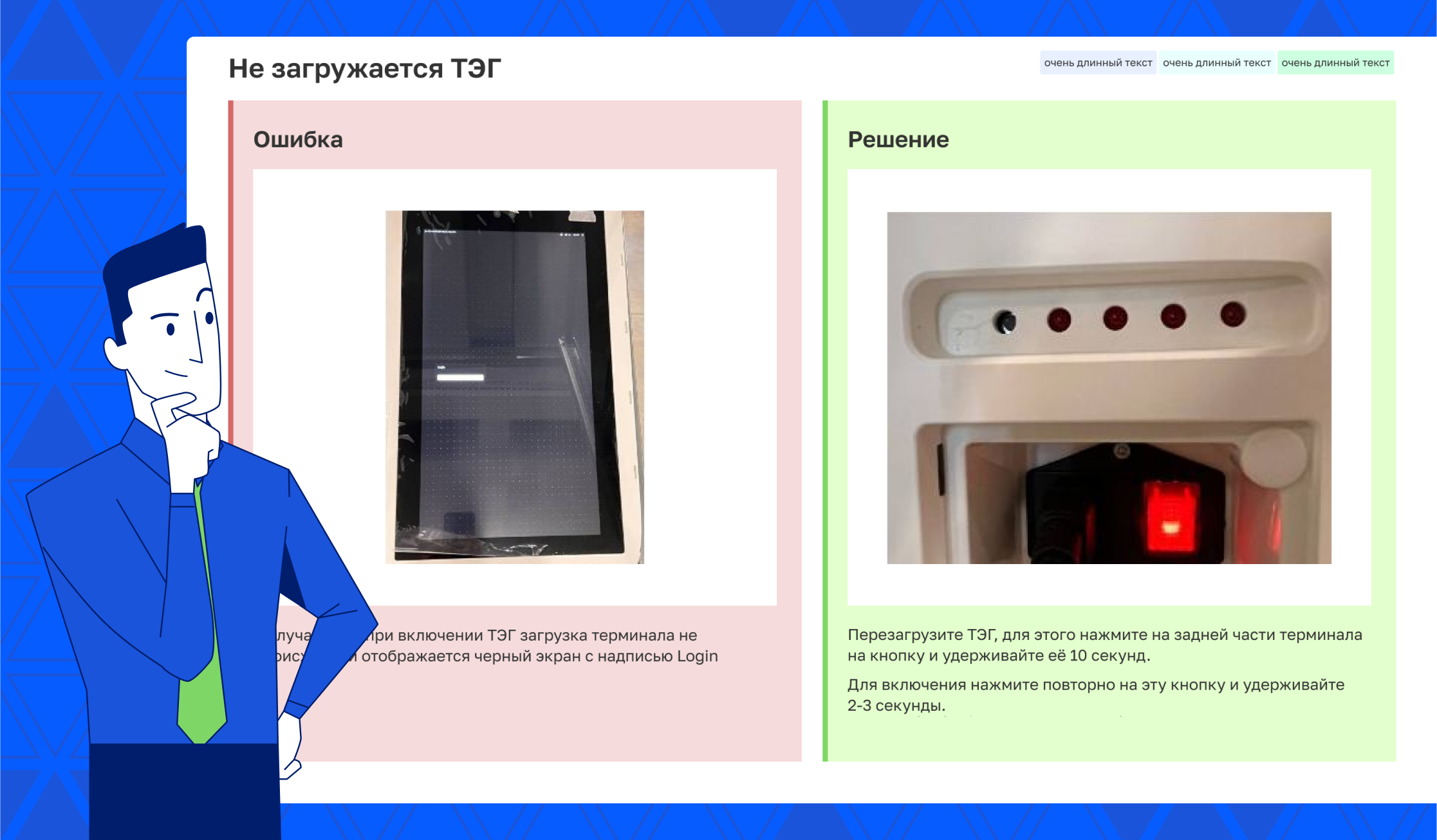 Чтобы снизить количество обращений в техподдержку, мы добавили раздел «Проблема-Решение» в виде карточек. В нем для экономии времени собраны подсказки для решений всех встречающихся однотипных ошибок.