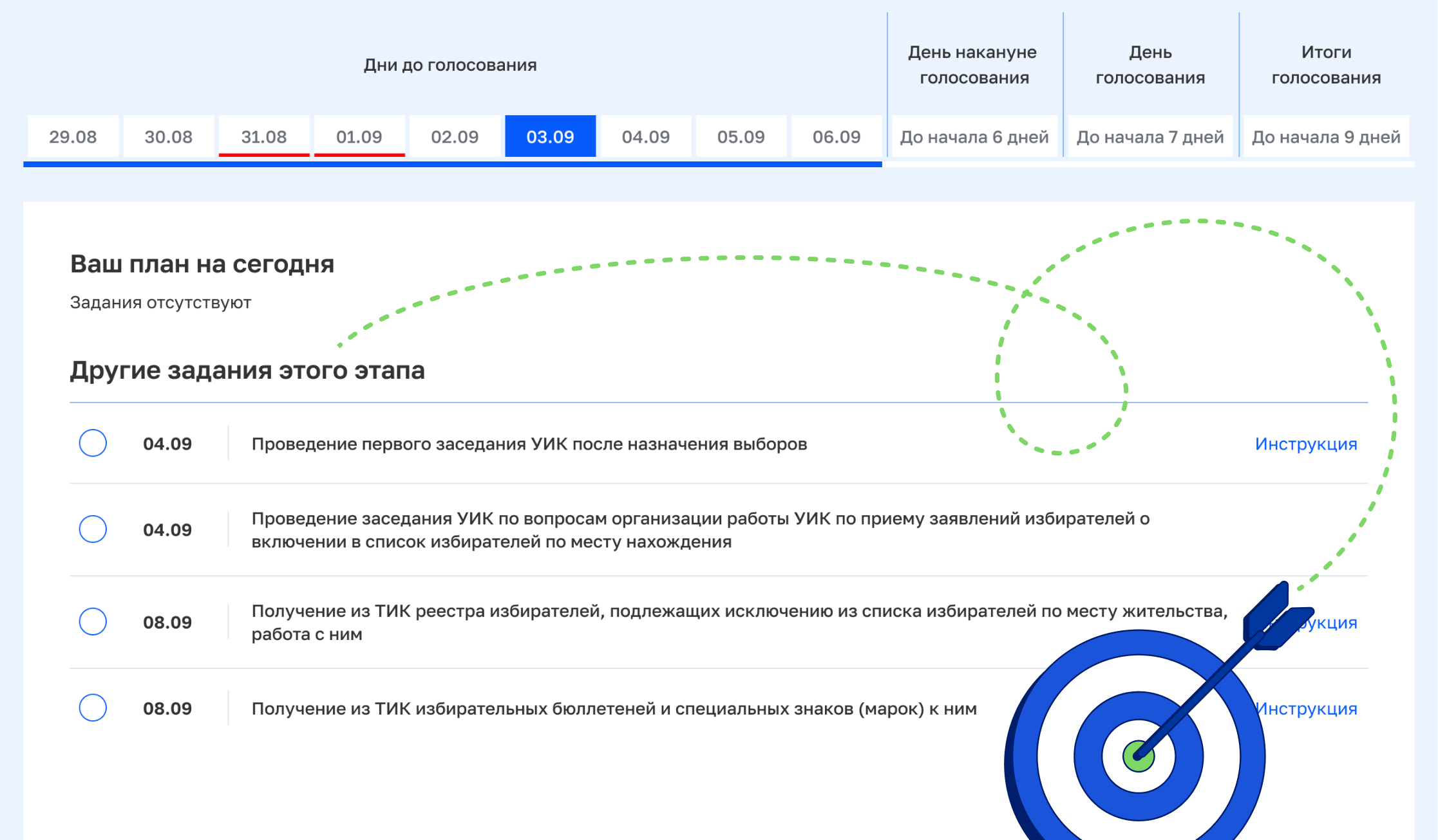 В НИК есть простой календарь, который помогает следить за голосованием. Он показывает этапы мероприятия, структурированные по дате. У каждого этапа отображается несколько статусов: