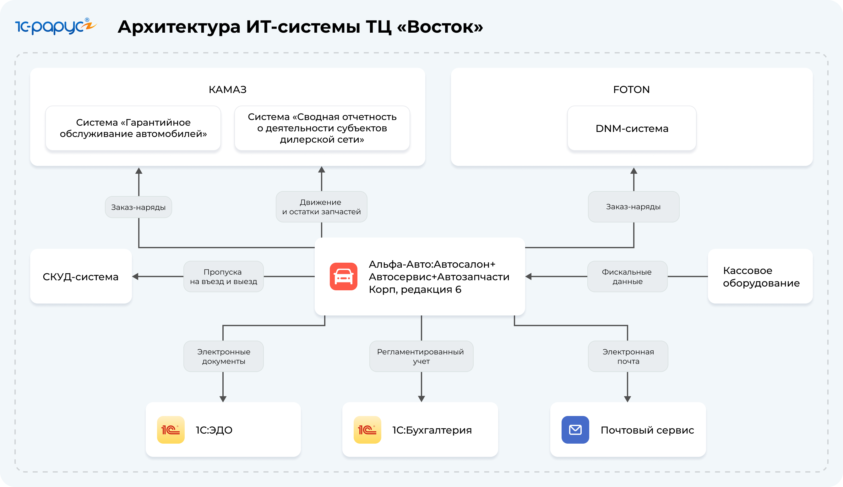 Интегрировать отраслевую систему с сервисами контроля оборота запчастей и заказ-нарядов автопроизводителей (FOTON, КАМАЗ).