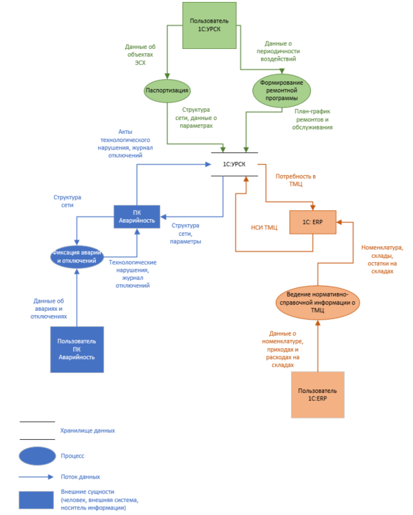 В рамках проекта было доработано интеграционное взаимодействие 1С:УРСК с 1С:ERP, в части получения данных о НСИ ТМЦ и передачи данных о потребности в ТМЦ. Данный обмен выполняется с помощью плана обмена. Также был доработан обмен с ПК «Аварийность», с которой 1С:УРСК обменивается данными посредством web-сервиса, в части передачи данных о структуре сети и параметрах оборудования и получения данных об актах технологического нарушения и журнала отключений.