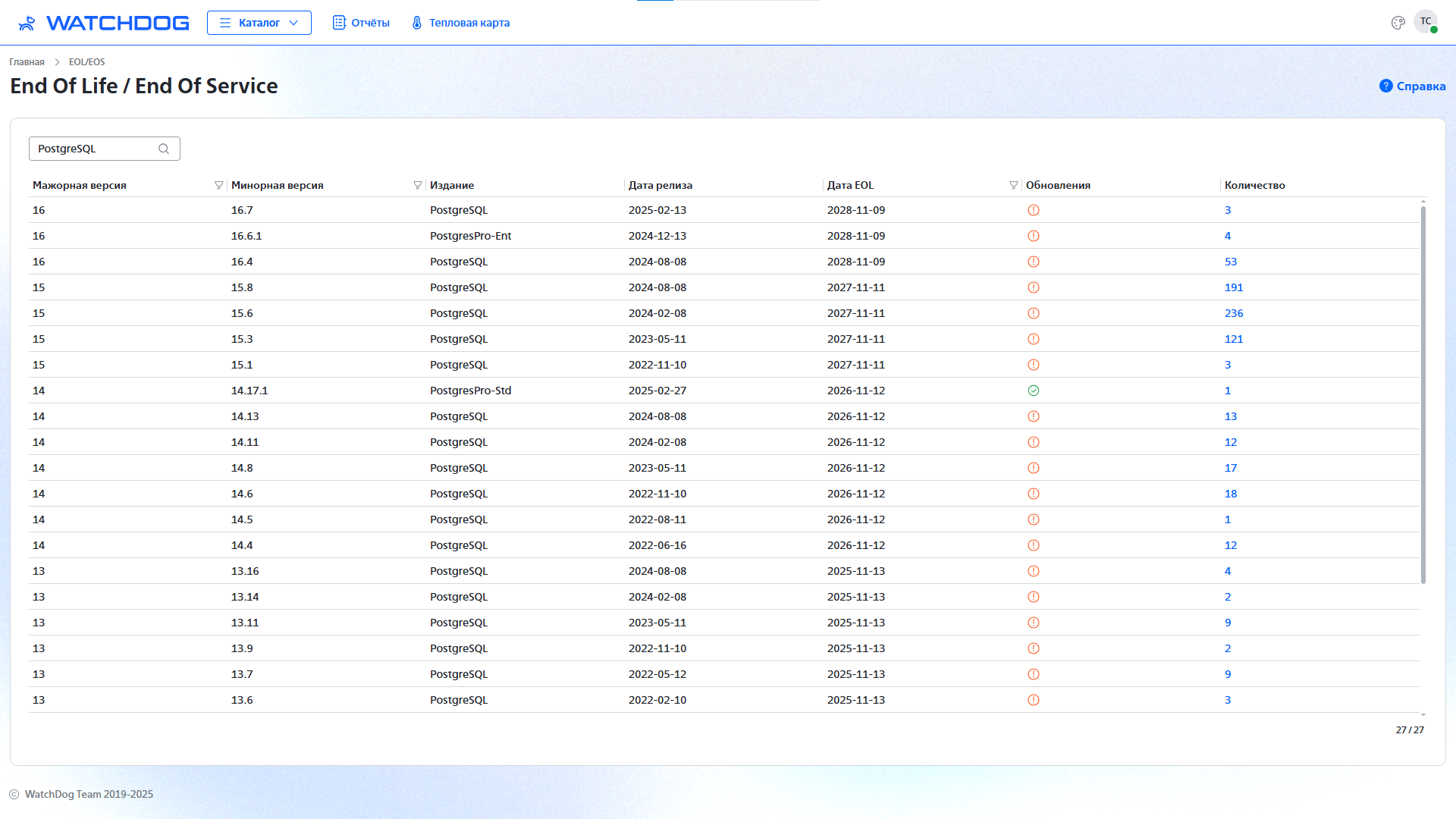 17 продуктов на поддержке