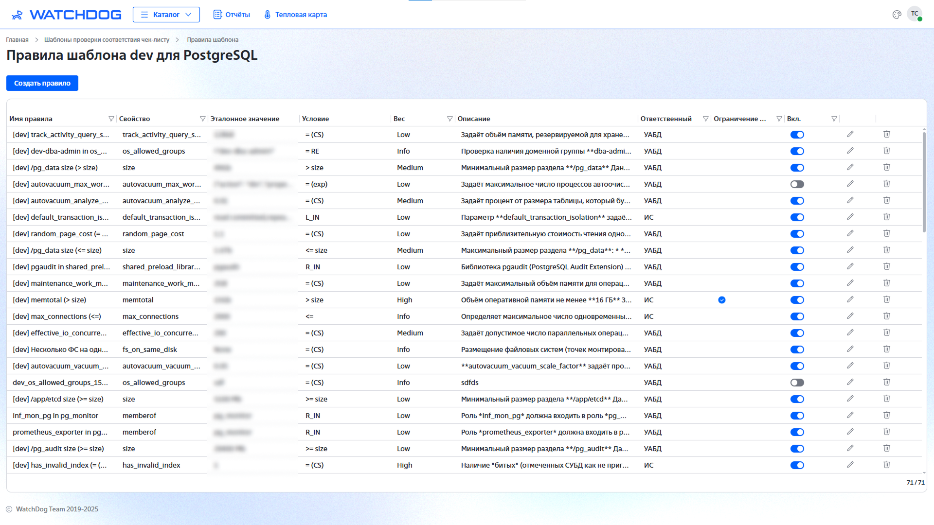 На основании собранных данных и выявления расхождений по Шаблонам (могут быть разные, в зависимости от критичности ИС, типов нагрузки, принятых исключениях (реализовано на стороне сервиса), информация выводится в раздел Тепловой Карты и, по принятому процессу, ведутся работы по устранению. Тем или иным подразделением, в чьей зоне ответственности отклонение. Согласно критичности параметра, контроль проходит несколько стадий (особенно актуально для допущения ИС к HS).