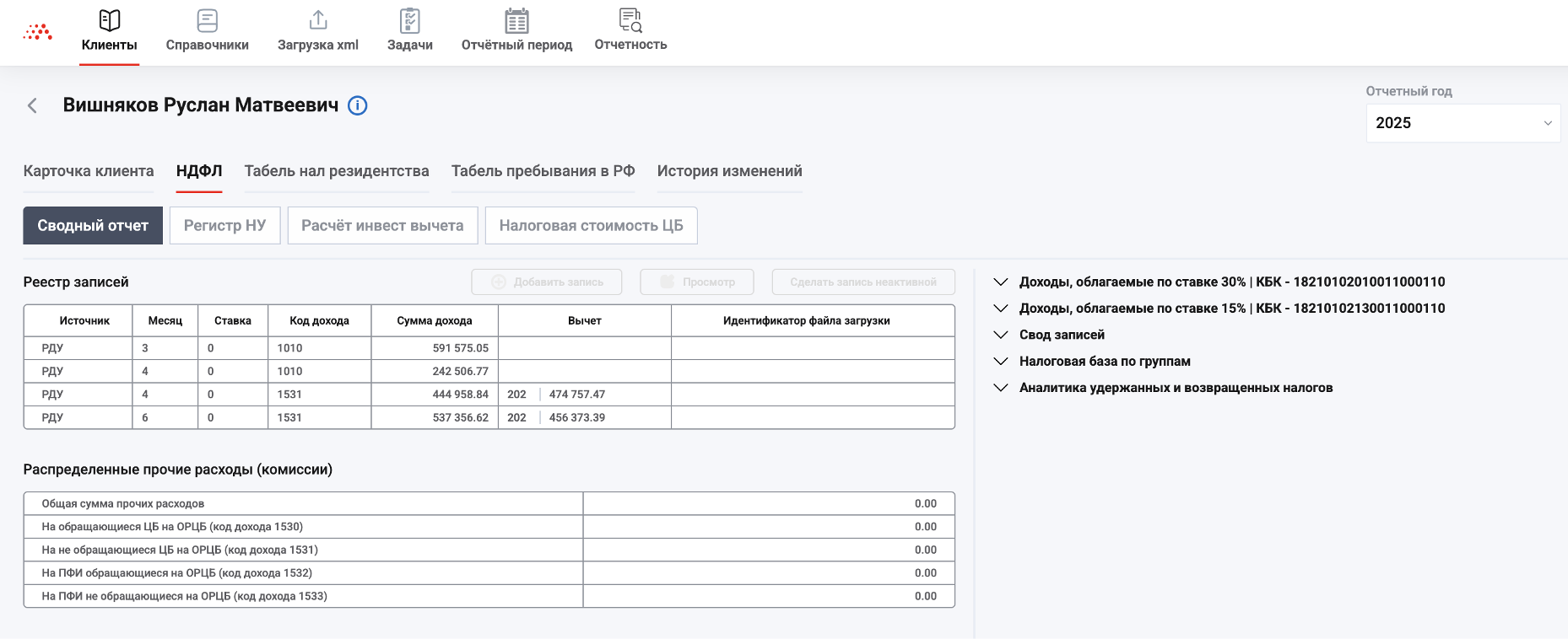 удобный интерфейс и управление расчетом НДФЛ клиента по финансовым данным из разных источников;