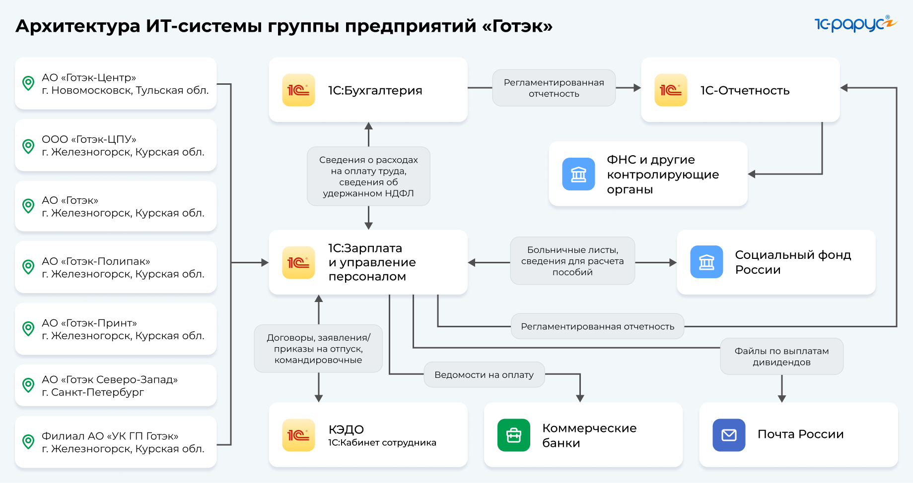 Расчет зарплаты для 7 предприятий группы «Готэк» приведен к единому стандарту. При этом учтены пожелания предприятий оставить привычный график выплаты зарплаты, а также реализована возможность ведения собственных зарплатных проектов с различными банками.