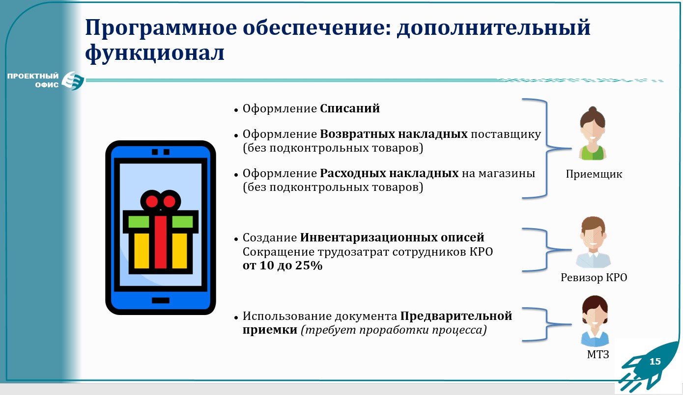 Также реализована «доверительная приемка», поставщиков и документы можно искать по QR-коду, а возвратные накладные и документы списания оформляются прямо с терминала.