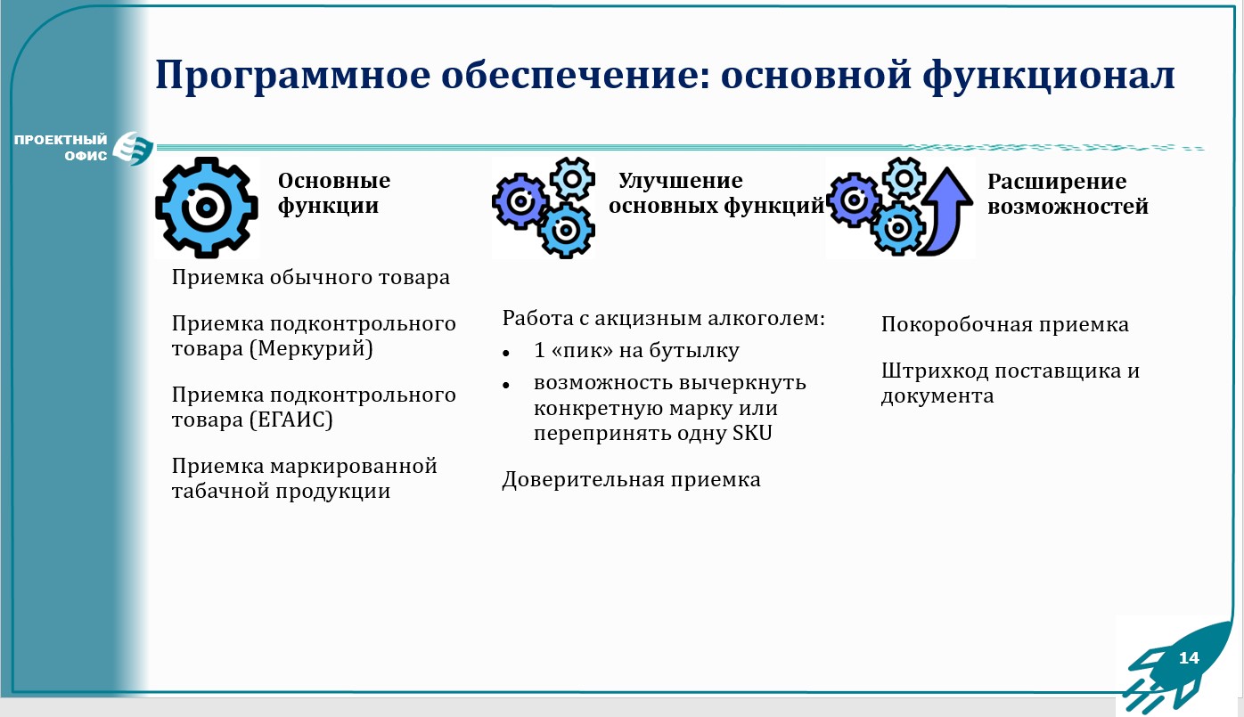 Решение позволяет принимать товар не только поштучно, но и покоробочно. Поддерживается прием подконтрольного товара и маркированной табачной продукции, есть интеграция с системами «Меркурий» и ЕГАИС. Акцизный алкоголь корректно заносится в базу за одно сканирование на бутылку, появилась возможность вычеркнуть конкретную марку или перепринять одну SKU.